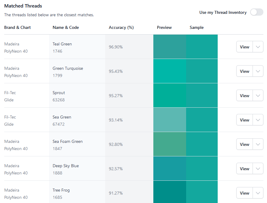 Our Thread Converter displays the results in a nice, compact, and friendly table interface so you can see the accuracy of the sample color you searched, and the match, all without any page refreshing.